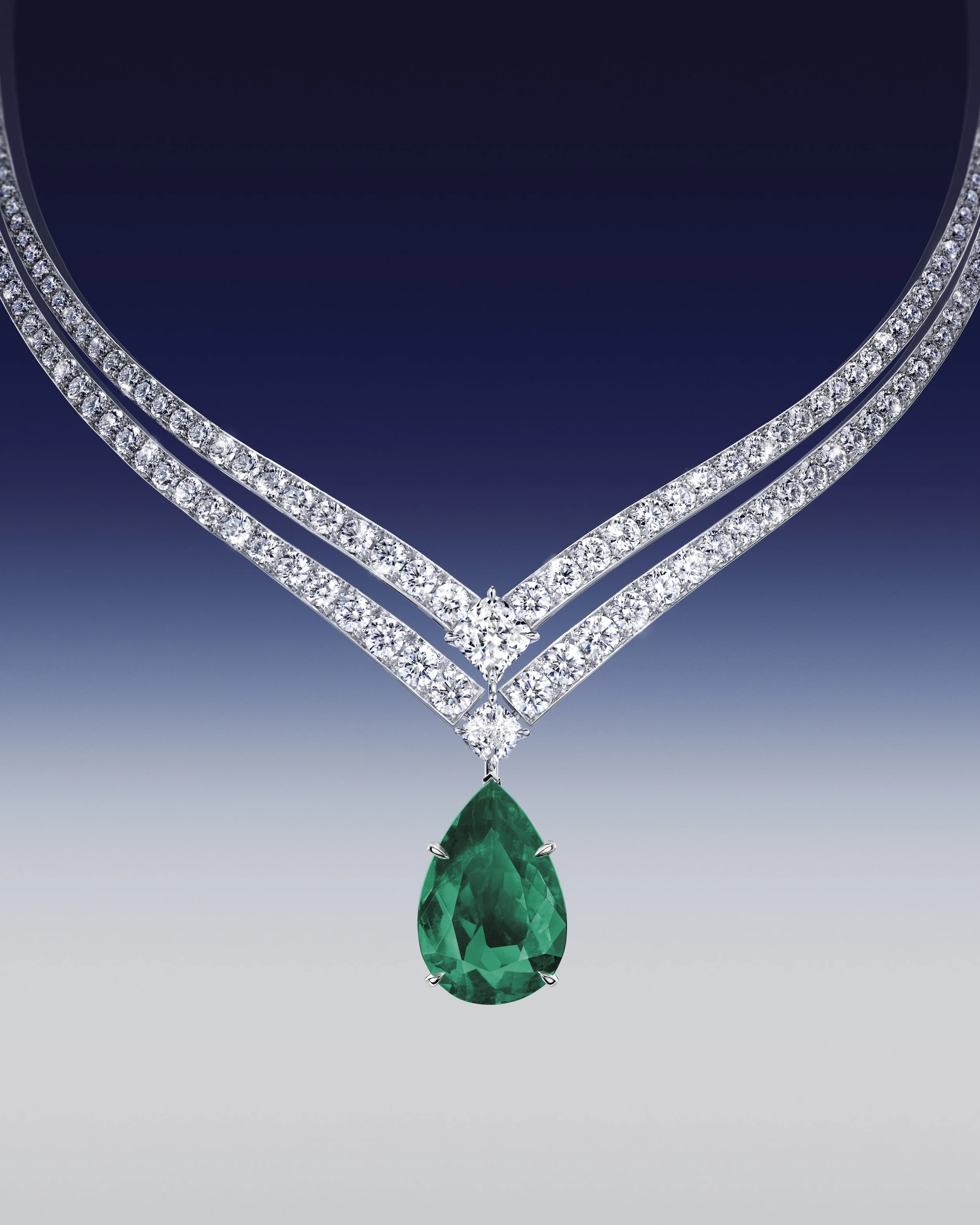 Sharp pear-cut diamonds form V-shaped silhouettes that recall the aigrette’s signature geometry, while the centrepieces are anything but background players. These stones are the main event.